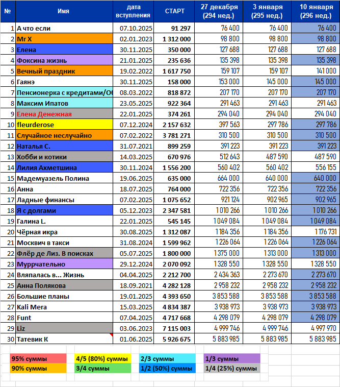В этот раз новостей и событий не очень много, я бы даже сказала критически мало. Явка тоже не была хорошей: больше половины участников эту перекличку пропустили. А я после праздников возобновляю дисциплину и теперь отмечаю все прогулы, и напоминаю, что после третьего пропуска подряд участник выбывает из марафона. Вечный праздник погасила 18107р и заняла первое место! На втором и третьем - Чёрная икра и Лилия Ахметшина, погасившие 7625 и 4247 рублей соответственно. Так держать, молодцы! И в погашении процентов от долга первое место также занимает Вечный праздник: её долг "похудел" на 11,38%. Лилия Ахметшина на втором месте: она погасила 0,76% от долга. На третьем месте - Чёрная икра с результатом всего минус 0,64%. Поздравляем! В остальных номинациях изменений не было: кто на каких местах был, на тех и остаётся. А результаты всех участников - как обычно, в карусели таблиц: На этом пока всё. Следующая перекличка в субботу, а в ближайшее время я постараюсь подвести итоги года. Всем спаси