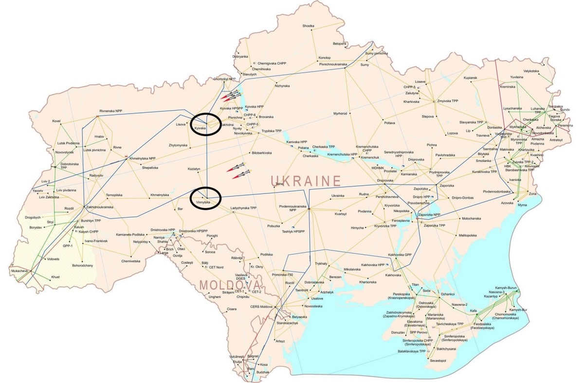 Теперь идет волна крылатых ракет - западнее Киева за Бородянку и юго-западнее в направлении Белой Церкви. Мониторы похоже сами уже запутались в этой круговерти. Пока есть вариант подстанций в черных овалах.