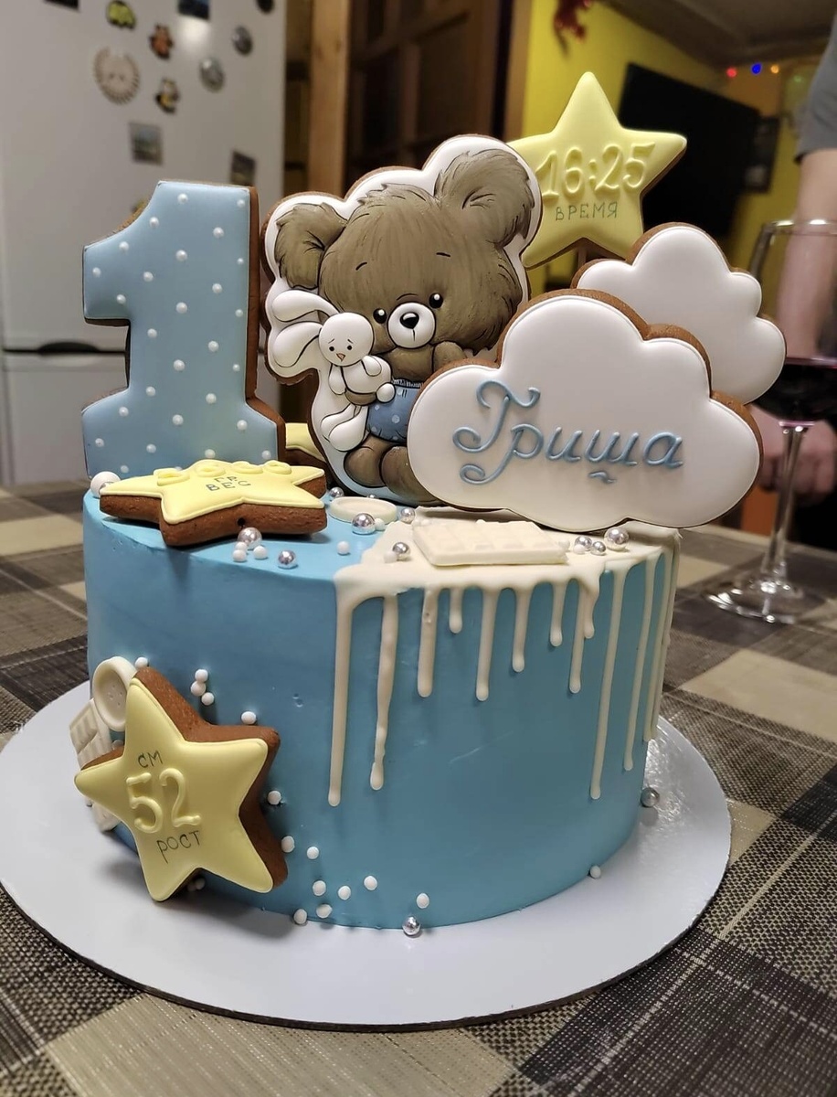 Вчера моему сыну Грише исполнилось 4 года, и каждый год я заказываю ему разные торты. Например, вот такой торт с мишкой я ему заказала на год. А торт с персонажами "Маша и Медведь" – на 2 года. Он мне понравился визуально меньше первого, потому что был более синим. Я не люблю такие насыщенные оттенки. Конечно, если мы берём сладости для первых двух лет, то Гриша абсолютно ничего не запомнил, но вот торт, который у него был на 3 года, с Бубой и мышью, он не просто зафиксировал в памяти, а ещё и регулярно вспоминал. Дети, которые растут в психологически здоровой атмосфере, прекрасно помнят своё детство и знают, какие торты у них были на дни рождения. Сейчас у него один из любимых мультиков "Три кота", но также Гриша любит тематику роботов, поэтому он попросил торт именно с ним. Так как у кондитера большая загрузка, торт я заказывала заранее, примерно за 2 недели. Дизайн выбирала наиболее современный из тех, которые предложены на различных ресурсах. Мне надоели торты с пряниками и изома
