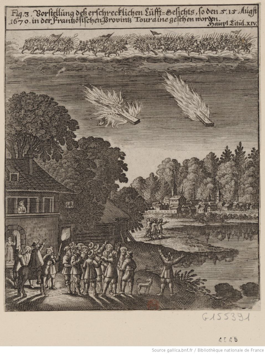 Иногда история оставляет нам не ответы, а немые улики. Одной из таких улик стала загадочная гравюра XVII века, связанная с необычными событиями, произошедшими во Франции летом 1670 года. Речь идет о регионе Турень, где с 5 по 15 августа жители наблюдали нечто, что не поддавалось привычным объяснениям. Гравюра носит тревожное название - «Изображение ужасного явления, наблюдавшегося в Турене с 5 по 15 августа 1670 года». Она хранится в Национальной библиотеке Франции и входит в коллекцию Мишеля Хеннина, собрание гравюр, относящихся к истории Франции. Документально работа датируется периодом 1670–1671 годов и входит в том 50, части 4532–4594. На этом, по сути, официальная информация заканчивается. Небо, которое пугало На гравюре изображено не просто редкое небесное явление. В верхней части композиции можно различить две армии, словно сходящиеся в бою прямо в облаках. Ниже показаны вытянутые пылающие объекты, напоминающие доски или балки, охваченные огнем. Они не выглядят случайными - каж