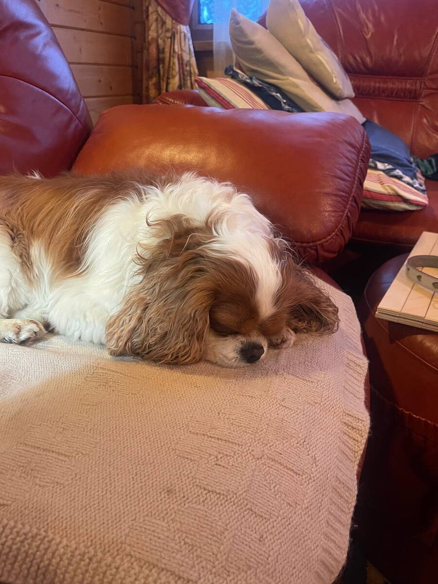 Джесси спит на тёплой вязанной подстилке . На улице мороз.