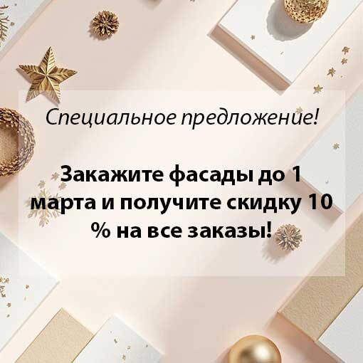 ! С наступающим Новым годом! В это праздничное время мы рады предложить вам эксклюзивные условия для заказа фасадов, чтобы сделать ваше сотрудничество с нами еще более выгодным и приятным. Специальное предложение: Закажите фасады до 1 марта и получите скидку 10 % на все заказы! Почему стоит работать с нами? 1. Широкий ассортимент: Мы предлагаем разнообразные фасады, которые удовлетворят любые потребности ваших клиентов. 2. Индивидуальные решения: Мы готовы предложить уникальные дизайны и материалы, чтобы вы могли выделиться на рынке. 3. Поддержка и обучение: Наша команда готова предоставить вам всю необходимую информацию и поддержку для успешных продаж. 4. 🎁 Подарок для каждого заказчика: При размещении заказа на сумму от 50 тыс. вы получите специальный подарок — образцы новых отделок. С уважением к Вам и Вашему бизнесу.