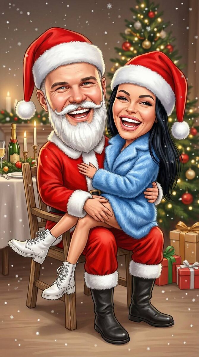 И сгенерировать классную открытку 🫢❤️ ⚙️ Промт Используй референс людей. РЕФ 1 - мужчина, РЕФ 2 - женщина. Сохрани узнаваемость обоих: черты лица, возраст, мимику, пропорции, причёски. Не добавляй новых людей и не убирай существующих, в кадре ровно 2 персонажа. Сделай яркую новогоднюю карикатурную иллюстрацию с крупными головами и слегка преувеличенными эмоциями, но лица должны оставаться похожими на референсы. Сцена: мужчина в образе Санты сидит на деревянном стуле и держит женщину на руках, женщина сидит поперёк его колен, оба громко смеются и смотрят в камеру, максимально весёлое настроение. Мужчина: костюм Санты красный с белой меховой окантовкой, красная шапка Санты, широкий чёрный ремень с пряжкой, чёрные сапоги, белая борода и усы. Женщина: красная шапка Санты, голубая пушистая шубка из искусственного меха, белая обувь на шнуровке, праздничный макияж. Деревянный стул. На заднем плане праздничный стол с бутылкой, бокалами и свечами. Слева наряженная ёлка с игрушками. На полу по