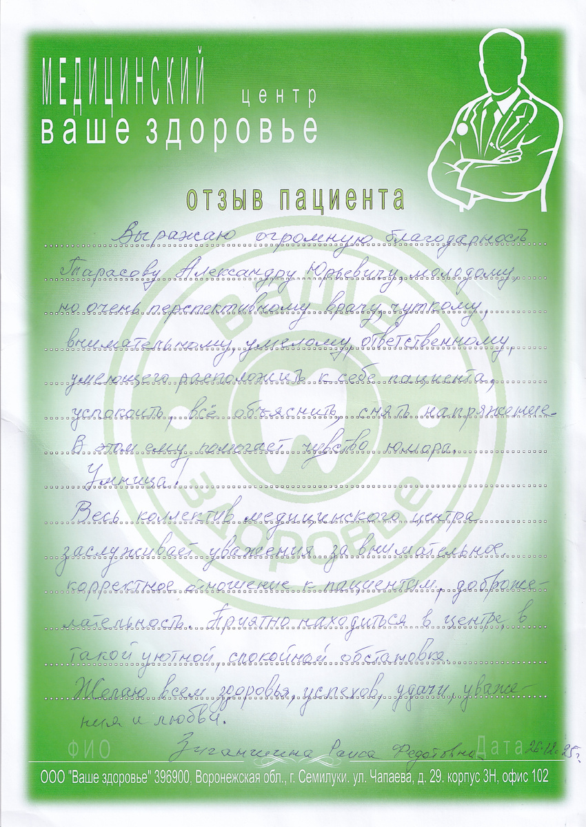 Выражаю огромную благодарность Тарасову Александру Юрьевичу, молодому, но очень перспективному врачу, чуткому, внимательному, умелому, ответственному, умеющему расположить к себе пациента, успокоить, всё объяснить, снять напряжение. В этом ему помогает чувство юмора. Умница!