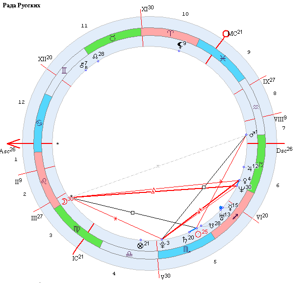 Прогнозировать события в жизни людей, у которых плотность оных в разы больше, чем у среднестатистического, гораздо интереснее и приятнее, поскольку есть над чем поразмышлять и прикинуть замыслы Бога в этом мультиверсе. Именно поэтому я решила посмотреть, как будет развиваться тренд относительно транзитного Нептуна и помогающего ему ненадолго Сатурна, которые, встретившись в марте 2026 года в точном соединении в декорациях Овна, будут достраивать квадратурой напряжение на 6-домную Венеру. И это определенный отсыл к событиям лета-осени 2025 года. Будем опираться на данные рождения, которые озвучены самой Радой.Гороскоп выглядит так: Вороша прошлое, отмечаем типичные нептунианские проделки: с обманом (затуманивание, действие за спиной, морок и иллюзия), с наездом религиозно-сектанской организации "Русская община", со сменой локации-ближе к воде, а если быть точнее-прямо в нее самую, в Царство Нептуна, дабы скомпенсировать влияние транзитного Нептуна, что вообщем-то было выбрано Радой инт