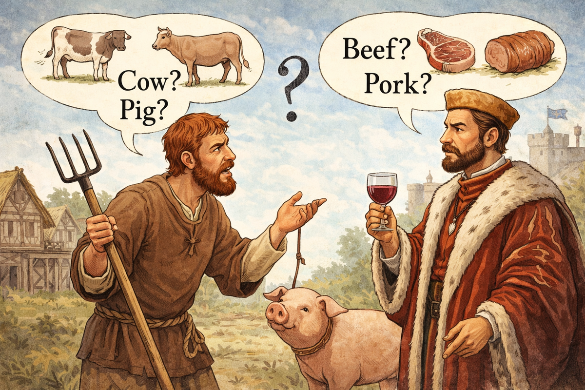 Это не случайность. И не странность. Это история завоевания, спрятанная в словах. В 1066 году Англию завоевали норманны. Они говорили по-французски. Как строилась их жизнь? И в языке это закрепилось навсегда. Слова для живых животных — англосаксонские: Это язык фермы, грязных рук и повседневной жизни. Слова для мяса пришли из французского: Это язык кухни, пиршеств и дворцов. Интересный факт: во французских словах мясо звучит дороже и изысканнее. Сравните: Даже сегодня: I eat cow — звучит грубо и странно