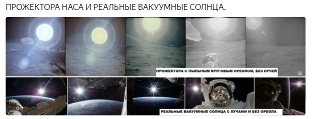 Правда, кинооператор Л. Коновалов относит появление кругового гало вокруг прожектора вместо радиальных лучей на фейках НАСА к отражению от световозвращающих шариков на вертикальном экране заднего плана в 30-метровом съемочном павильоне НАСА. На который проецировались с проектора горы в виде слайдов. Однако не все фотофейки с контровым светом прожектора- Солнца имеют такой экран. А вот один-два замкнутых "обруча" вокруг диска - все фото.