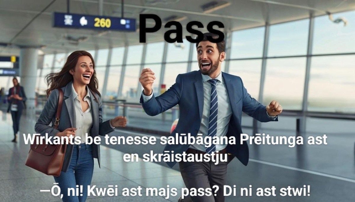 #prūsiskai_kōmiksai@prusiska_bila Pass Wīrkants be tenesse salūbāgana Prēitunga ast en skrāistaustju. —Ō, ni! Kwēi ast majs pass? Di ni ast stwi! —Wīrkante... —Di ni ast en majjai krepšei... Be di ni ast en majjai jakkei... —Adder Wīrke... —Ō! Majs pass ast en taksei! Wīrkants bēga prēi taksin. —Wīrke, ni! Prēitunga bēga prēi Wīrkantan. —Ō, ni, taksi teinū ni ast stwi! Sta ast debīkan prōbleman! —Wīrkante! Twajs pass ni ast en taksei. Twajs pass ast en twajjai rānkai. —Ō... Dīnkun, majā mīli! Паспорт Виркантс и его жена Прейтунга в аэропорту. —О, нет! Где мой паспорт? Его здесь нет! —Виркантс... —Его нет в моей сумке... И его нет в моей куртке... —Но Вирк... —О! Мой паспорт в такси! Виркантс бежит к такси. —Вирк, нет! Прейтунга бежит к Виркантсу. —О, нет, такси сейчас здесь нет! Это большая проблема! —Виркантс! Твой паспорт не в такси. Твой паспорт в твоей руке. —О... Спасибо, моя любовь. Приходите на бесплатное пробное занятие по прусскому языку и вступайте в наш учебный чат! У