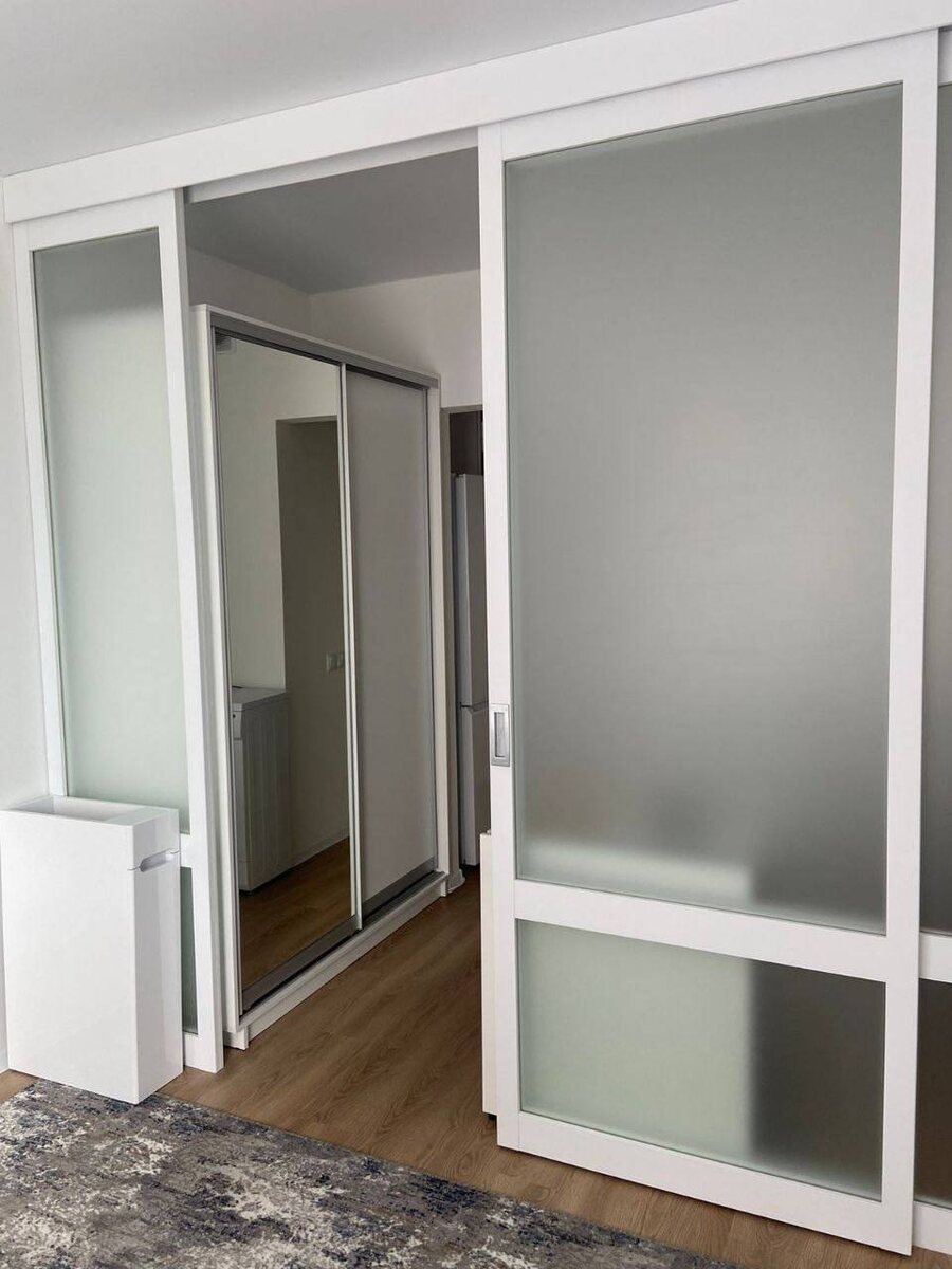 Асимметричное решение с аккуратными перемычками снизу. Профиль в экошпоне, матовое стекло. Данная перегородка аккуратно зонирует студию, не «съедая» метры. 📌Нравится такой формат? Напишите нам — рассчитаем вариант под вашу квартиру.