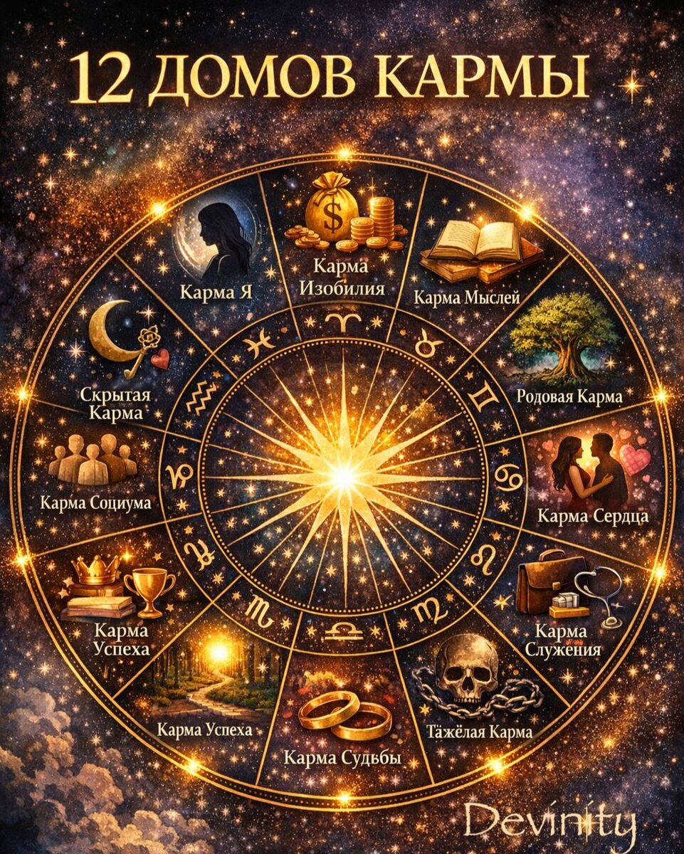 ⭐️⭐️⭐️⭐️⭐️⭐️❤️ «1️⃣2️⃣ ДОМОВ КАРМЫ: ГДЕ ЖИВЁТ ТВОЯ СУДЬБА» Каждый дом — отдельная сфера, каждый дом — свой кармический урок. 1️⃣ Дом Личности — карма Я Про что: самооценка, образ себя, личный путь, выборы Вопрос: Какую карму я проживаю через себя и свои решения? 2️⃣ Дом Денег — карма изобилия Про что: деньги, ресурсы, ценность себя, долги Вопрос: Какие кармические причины влияют на мои финансы? 3️⃣ Дом Мышления и Слова — карма мыслей Про что: мышление, речь, убеждения, обучение, информационное поле Вопрос: Как мои мысли и слова формируют мою карму? 4️⃣ Дом Семьи и Рода — родовая карма Про что: родители, детство, дом, корни, родовые сценарии Вопрос: Какую карму я несу из рода? 5️⃣ Дом Любви и Радости — карма сердца Про что: любовь, дети, удовольствие, творчество Вопрос: Почему мне сложно позволить себе радость и любовь? 6️⃣ Дом Работы и Тела — карма служения Про что: работа, обязанности, здоровье, тело Вопрос: Какую карму я проживаю через работу и физическое тело? 7