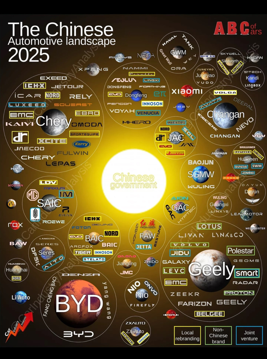 Во-первых, нужно понимать, что каждый китаец другому китайцу не родственник. Их там полтора миллиарда. Автопроизводителей, конечно, поменьше, но все же. Ниже привожу схематично более-менее актуальную информацию об автопроизводителях Китая и принадлежащих им отдельных брендах.