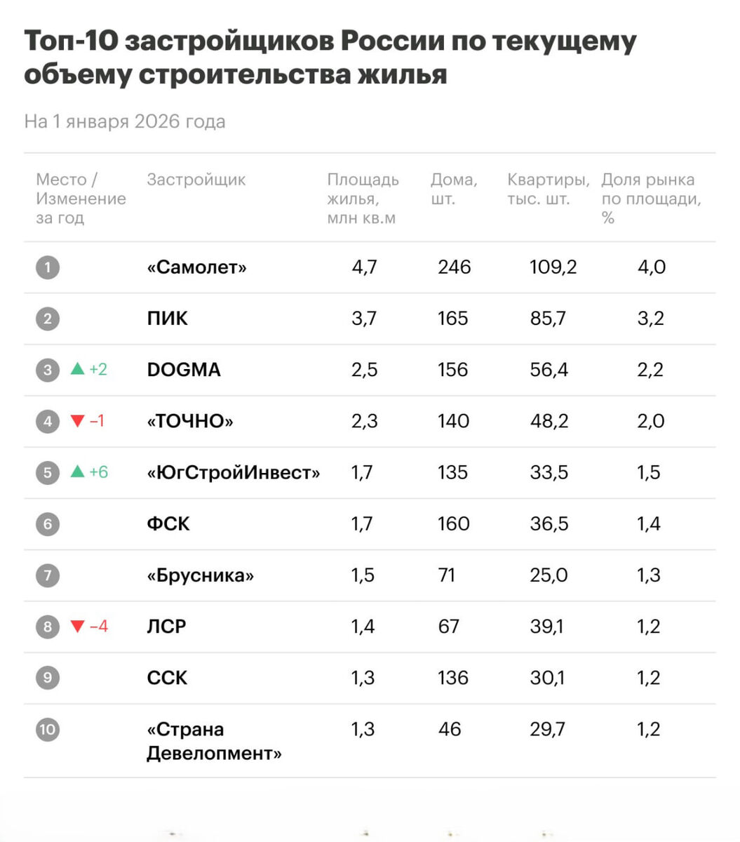 Рейтинг крупнейших застройщиков России, составленный на основе данных Единой информационной системы жилищного строительства (ЕИСЖС), показывает, что в ушедшем году состав игроков в основном сохранился, однако внутри первой пятерки произошли серьезные перестановки. 🏆 На вершине рейтинга уже два года без изменений находятся группа «Самолет» (4% рынка, 4.7 млн кв. м) и ГК «ПИК» (3.2%, 3.7 млн кв. м). На третье место поднялась компания DOGMA, сместив занявшую четвертую строчку «ТОЧНО». 💡Главной сенсацией года стал рывок компании «ЮгСтройИнвест» — год назад она не входила даже в десятку, занимая 11-е место, а по итогам 2025 года вошла сразу в первую пятерку, поднявшись на шесть позиций. Сейчас она строит 1.7 млн кв. м жилья, контролируя 1.5% рынка. 📌 Общая картина рынка такова: на начало 2026 года в России строится около 116.6 млн кв. м многоквартирного жилья, что на 1.9% больше, чем годом ранее. При этом совокупный объем десятки крупнейших застройщиков вырос лишь на 0.2%, а их доля на