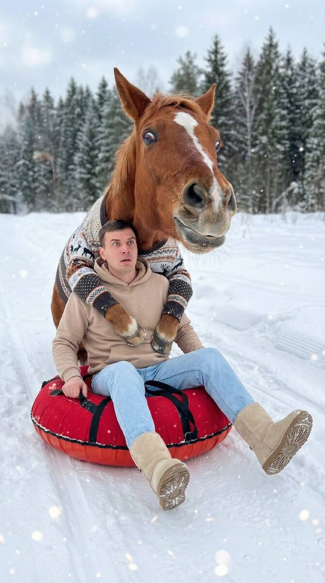 ! #юмор@promtgs 👉Быстрая автогенерация тут ⚙️ Промт Комичное фотореалистичное веселое зимнее фото. В кадре ровно 2 персонажа: человек с референса фото и лошадь. Полностью повтори черты лица не изменяя мимику. Человек сидит на красном надувном тюбинге на снежном склоне, ноги вытянуты вперед, выражение лица удивленное, человек смеется. Сзади вплотную стоит лошадь и обнимает человека передними ногами поверх плеч, как человек, будто позирует для смешного фото, лошадь с гримасой страха, боится спускаться с горы. На человеке: бежевый худи, светло голубые джинсы, бежевые зимние угги. Лошадь: тёплый вязаный свитер с зимним орнаментом, рукава на передних ногах. Красный тюбинг с чёрными ремнями и ручками. Лёгкие снежинки в воздухе. Мягкие искры боке на переднем плане. Без надписей и логотипов." Снежный склон, видны следы тюбинга, на заднем плане хвойный зимний лес, пасмурное небо, вокруг никого, без зданий и транспорта.", Мягкий естественный дневной свет, лёгкая морозная дымка, высокая дет