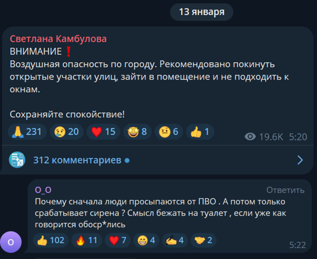 ⏰ Утро 13 января обнажило системную проблему оповещения жителей Таганрога. И дело не только в опоздании — дело в последовательности, которая переворачивает логику безопасности с ног на голову. Хронология несоответствия: 05:10 — первые залпы ПВО. Жители просыпаются от взрывов. 05:17 — мощные взрывы и вой сирен. 05:20 — первая публикация о беспилотной опасности в Telegram-канале главы города Светланы Камбуловой. Уловили парадокс? Сначала ПВО (ребятам СПАСИБО) отражает атаку, потом воет сирена, и только после этого — официальное оповещение. Хотя по элементарной логике безопасности должно быть наоборот: сначала предупреждение, потом сирена, потом ПВО. Камбулова регулярно подчёркивает в своих постах: для получения своевременной и достоверной информации читайте только её канал. Вот только на практике её канал стал последним источником информации после взрывов и сирены. Что-то не сходится с определением слова "своевременно", согласны? 07:14 — в Telegram-канале появилось сообщение о режи