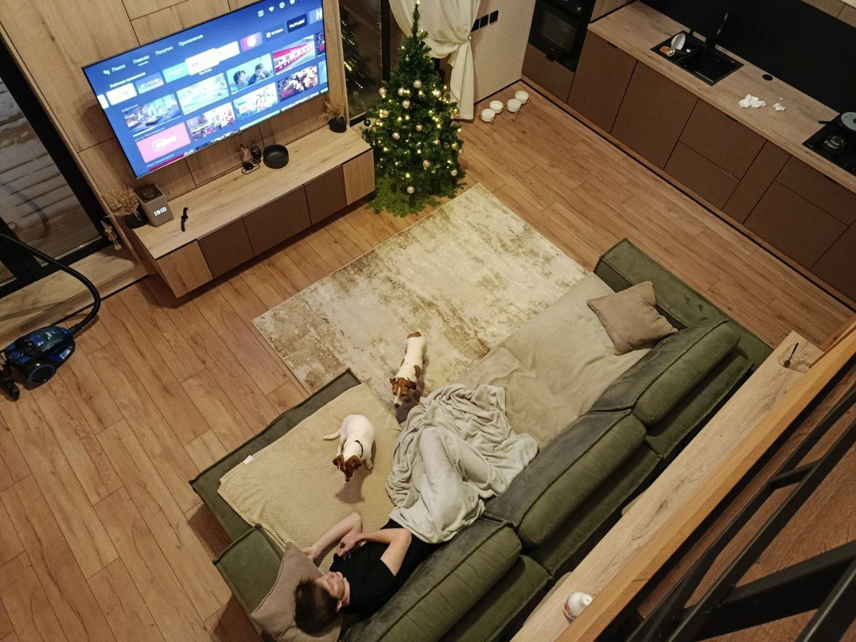 Всем добрых суток дня! Делюсь последними доделками по строительству своего дома. В гостиной занял свое место диван и елочка. Но так было не всегда) Прикинув цену керамогранита я решил остановиться на ламинате. Так дешевле и быстрее. Тем более для теплого пола ламинат тоже не плохой вариант. Подложку использовал хвойную 3мм. Все зрители заняли свои места и ждут красоту и чистоту. С подложкой разобрался за 2 часа. На укладку 50м2 ламината ушло 2 дня не спеша, основное время тратилось на подрезы. Особо каких-то проблем не встретил. Все четко и понятно. Единственное для подгонки ламинат в замок лучше использовать обрезки, так как в комплекте для укладки пластмаска уродует края. Пару раз применил и выкинул. Барная стойка заняла свое место. Приехал диван и зрители сразу заняли свои места, такое ощущение, что они его ждали особенно))) Вот такой теперь вид сверху. В комнате тоже уложил ламинат, все по той же схеме. Плинтуса везде черные будут, маленькие, алюминиевые. Настало время камина. Сдел