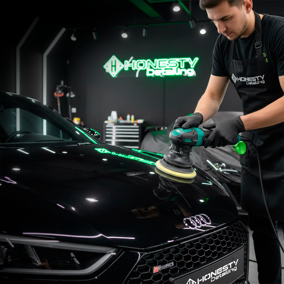 - Технология вместо грубой силы. Мы не используем агрессивную полировку «на скорость». Наша многоэтапная методика (абразивная, восстановительная, финишная антиголографическая) призвана убрать дефекты, максимально сохранив толщину заводского лака. Это гарантирует отсутствие «голограмм» и затертых граней.