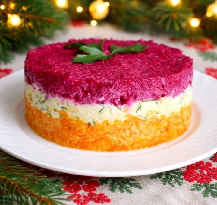 » ИНГРЕДИЕНТЫ: ✅ Свёкла — 2 шт. ✅ Морковь — 3 шт. ✅ Изюм — 1 стакан ✅ Грецкие орехи — 1/2 стакана ✅ Твёрдый сыр — 100 г ✅ Яйца варёные — 3 шт. ✅ Чеснок — 3 зубчика ✅ Сметана — 200 мл ПРИГОТОВЛЕНИЕ: 1. Свёклу отварить или запечь в духовке до готовности, остудить. Изюм залить кипятком и оставить на 10 минут, затем обсушить. 2. Сырую морковь натереть на мелкой тёрке и смешать с изюмом. 3. Твёрдый сыр натереть на тёрке. Белки варёных яиц натереть отдельно, желтки оставить для украшения. Смешать сыр, белки и чеснок, пропущенный через пресс. 4. Свёклу натереть на тёрке и соединить с измельчёнными грецкими орехами. 5. Выложить салат слоями, промазывая каждый слой сметаной: * 1-й слой — морковь с изюмом * 2-й слой — сыр с белками и чесноком * 3-й слой — свёкла с орехами 6. Верх салата смазать сметаной и посыпать натёртым яичным желтком. 7. Убрать салат в холодильник на 2 часа для пропитки, затем подать к столу. ПРИЯТНОГО АППЕТИТА!