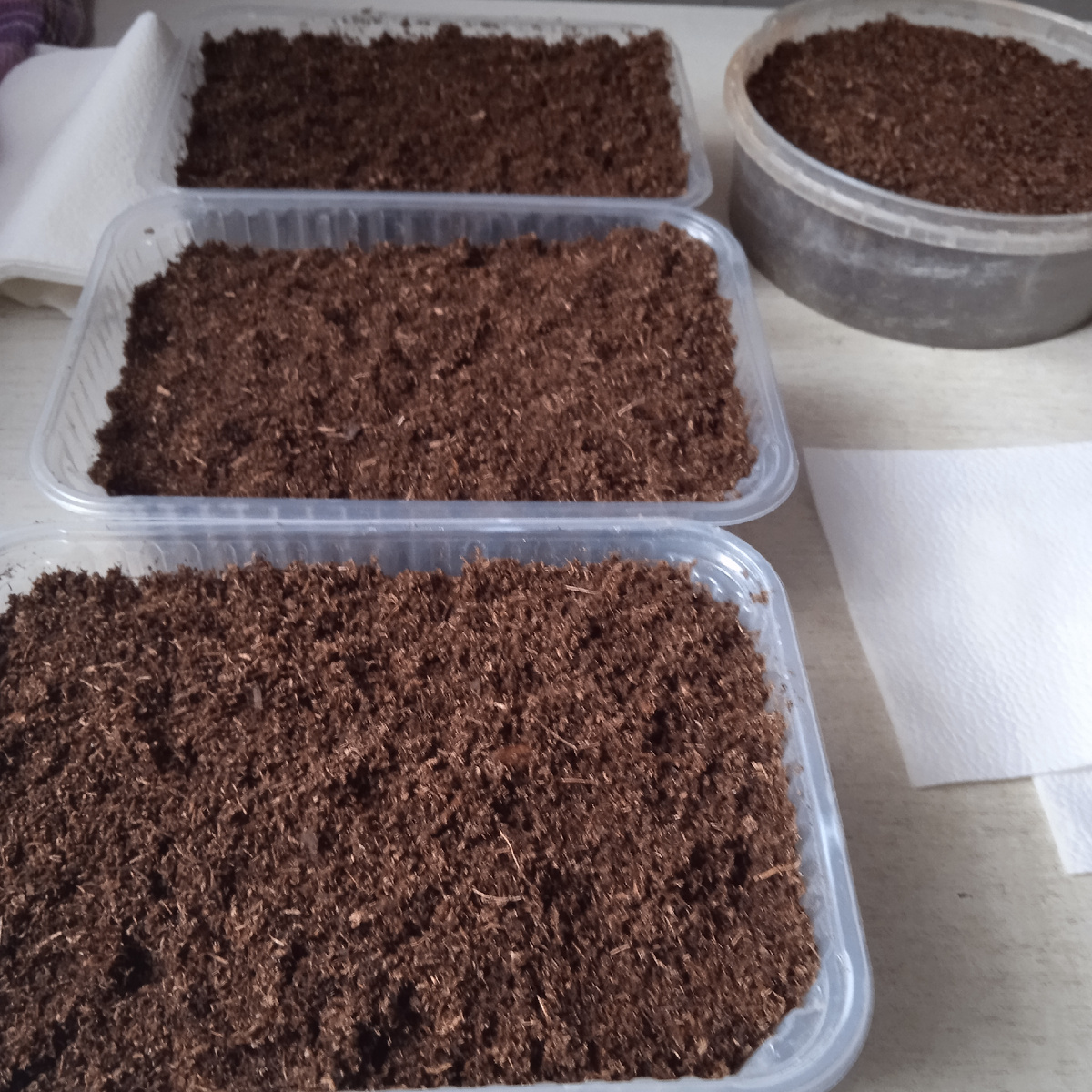 Многие еще в декабре этим озадачились и уже радуются первым всходам, а у кого-то и конь не валялся. Мой конь только сегодня поднялся. Вчера залила почвобрикет кипятком, а сегодня получила пушистый грунт. Вот такой мне и нужен для подснежного посева. Кстати, к врачу мы вчера так и не попали. Весь день и всю ночь шел обильно снег. Нас так завалило, что не выбраться. Кое- как вызволили внука из школы и то дед застрял у нас в переулке, да еще упал неудачно. А когда стал перезаписываться (на Госуслугах) , то выяснилось, что нас нигде не зафиксировали, хотя вызов был. Ну, понятно, дед же записывался 29 декабря, не до нас им было! Это даже и хорошо, а то бы напрасно промучались, в это время, что нам было назначено, даже приема у нашего врача нет. Видать уже хорошо встретили Новый год. Теперь 19 поедем, если выедем. Зато сегодня с утра сразу занялась посевами. Обрезала дно у плошек, поставила на крышку и выстелила салфеткой. Только потом заполнила грунтом, он почти сухой. Затем аккуратно посе