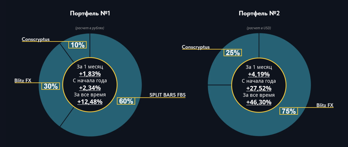 Хочу сразу отметить, что результаты Портфеля №1 не совсем корректны. Объединять стратегии, номинированные в разных валютах, с пересчётом в рубли, конечно, удобно для отслеживания текущего состояния капитала. Однако это совершенно не подходит для справедливого анализа нашей работы. Из-за аномального укрепления рубля в 2025 году, бóльшая часть доходности валютных стратегий была «съедена».