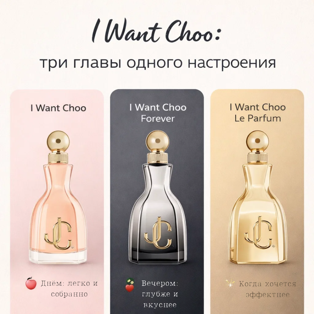 У линейки Jimmy Choo I Want Choo все именно так: один характер, три флакона и три разные сцены жизни. Это как капсульный гардероб в ароматах: днём, вечером и «когда нужен эффект». Первая глава - классический I Want Choo. Это та версия, с которой удобно начинать знакомство с линией. В пирамиде звучат сочная мандариновая нота и бархатный персик, затем вступают жасмин и красная лилия (тот самый лилейный акцент), а в базе - мягкая ваниль. По ощущениям это дневной аромат с хорошим настроением: Сценарии ношения: I Want Choo работает как яркая помада нюдового цвета: с ним немного более нарядно, чем без него. Вторая глава - I Want Choo Forever. Здесь настроение заметно меняется: аромат становится темнее и объёмнее. По пирамиде это восточно-кипревая гурманская композиция: в верхних нотах заявлены черная вишня и роза, затем вступают жас
