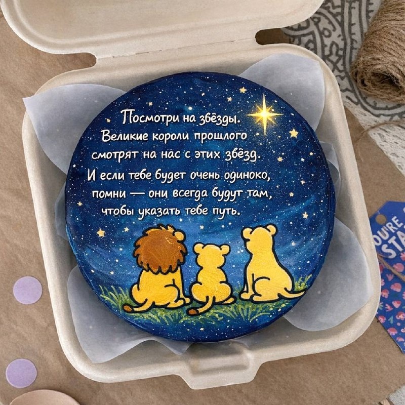? Как бы ни был радостен праздник, неделю назад мы столкнулись с большой утратой. Мама мужа долго боролась с раком и к сожалению в этой борьбе мы проиграли (по этой причине меня было так мало в конце декабря и начале января). Мне очень хотелось и поддержать, и поздравить, но очевидно, забавные картинки и фразы были неуместны. За поиском идей я пошла в интернет, но ничего даже на грамм подходящего не нашла. Прокручивая в голове тысячу мыслей, я вспомнила мультфильм «Король Лев», а именно момент, где Муфаса и Симба смотрят на звезды, и старший Лев говорит про великих королей, которые смотрят на нас с неба и оберегают нас от любых бед. Так родилась идея воплотить нашу семью в виде львов, смотрящих на звездное небо. В интернете опять же были только забавные картинки, которые совершенно не подходили, поэтому я пошла в ChatGPT. Так и появилось готовая идея, которую мне бережно помог воплотить кондитер. Идею и реализацию вы видите на фото. Муж тепло оценил такой жест, а у меня в этом