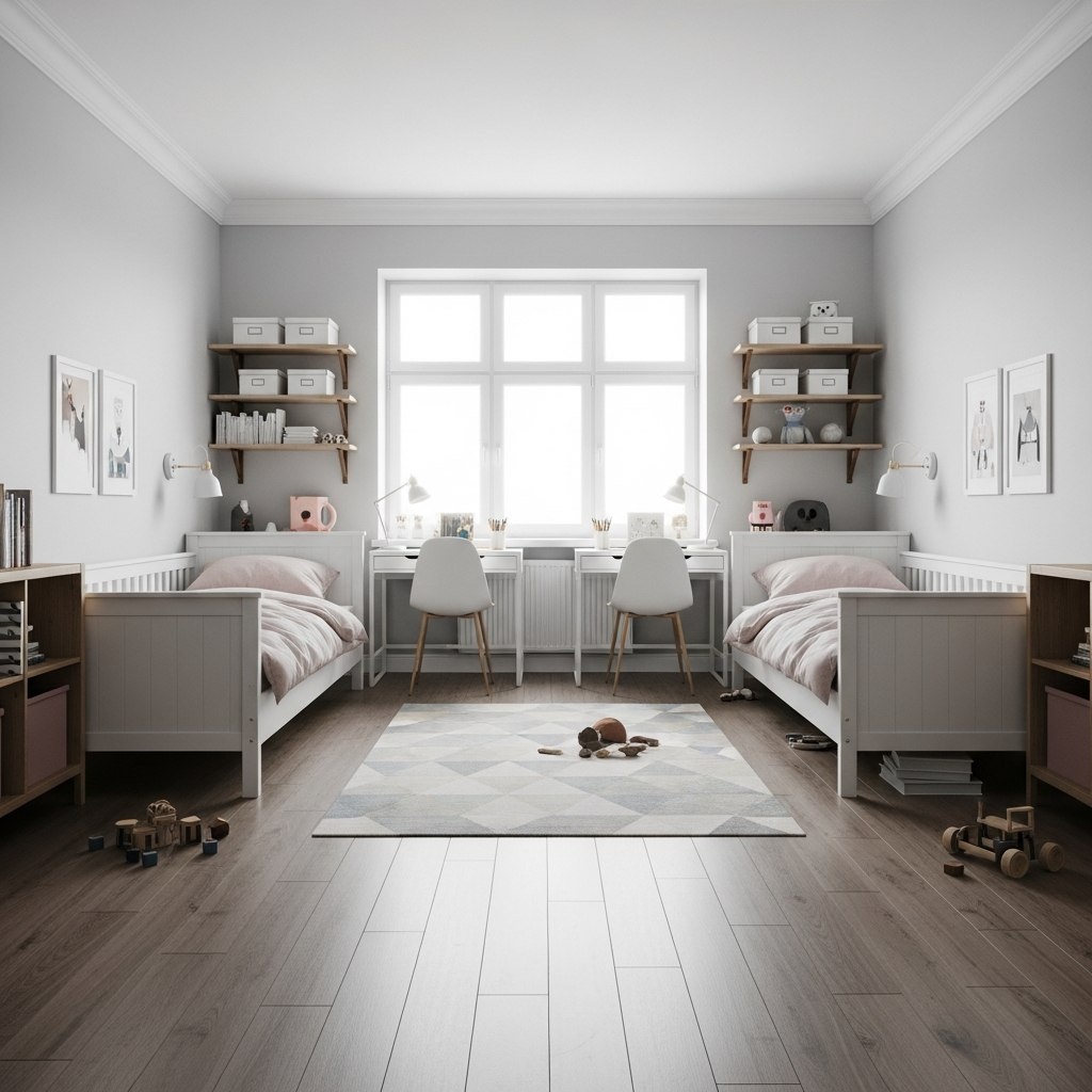 Это про логику использования пространства. Где спят, где учатся, где играют — и как эти зоны не мешают друг другу. Три рабочие схемы планировки: 1. Параллельная планировка Комната делится пополам воображаемой линией. Идеальна для прямоугольных комнат от 16 м² и детей одного возраста. 2. Угловое расположение Кровати и столы вдоль смежных стен буквой L. Подходит для разнополых детей или большой разницы в возрасте. Минимум 14 м². 3. Частичное совмещение Общая двухъярусная кровать, длинный стол (минимум 140 см), но раздельное хранение. Для компактных комнат. Важные правила: • Столы — ближе к окну • Кровати — подальше от батарей • Минимум 2 м² свободного пола для игр МебельСнов создаёт индивидуальные дизайн-проекты с правильным зонированием под ваши квадратные метры. Замер, проект, производство и монтаж под ключ 📐