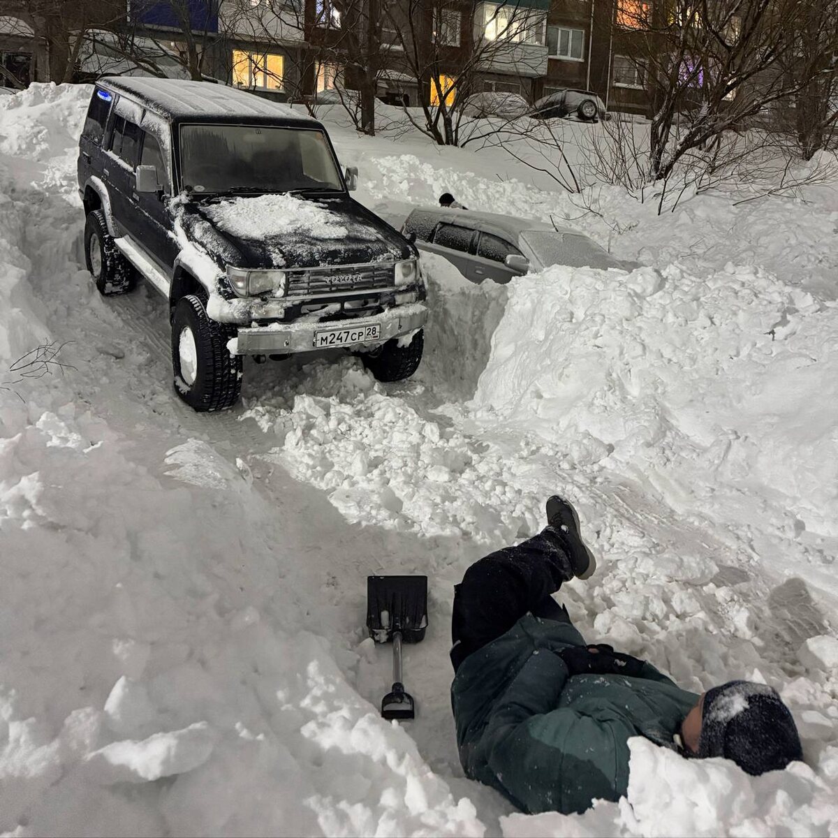 Это я лежу в снегу после двух часов махания лопатой и думаю