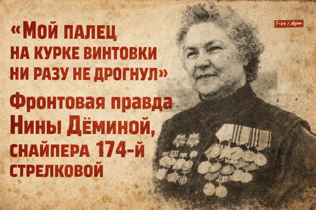 Эти воспоминания принадлежат Нине Петровне Дёминой (в девичестве — Исаевой). Родом она из Томской области, 1924 года рождения. На фронт ушла добровольцем в феврале 1943-го, совсем девчонкой. Всю войну прошла снайпером в 174-й стрелковой дивизии. Её боевой путь отмечен высокими наградами — орденами Славы и Отечественной войны, медалями «За отвагу» и «За взятие Кёнигсберга». Но эта история — не о наградах. Это её личный рассказ о том, как это было.