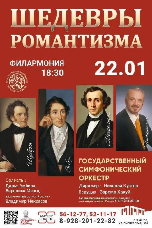 » В программе – произведения композиторов эпохи романтизма, отличающиеся выразительностью образов и насыщенной гармонией: Ф. Шуберт – Симфония №8, К. Вебер – Сцена и Ария Агаты из оперы «Вольный стрелок», Ф. Мендельсон – Концерт для фортепиано с оркестром №2, А. Пьяццолла – «Ave Maria». В концерте примут участие солисты: Дарья Умбина (сопрано), Вероника Мезга (фортепиано), заслуженный артист России Владимир Некрасов (аккордеон). Мероприятие входит в программу «Пушкинская карта»🟥 💬Минкульт Адыгеи в МАХ