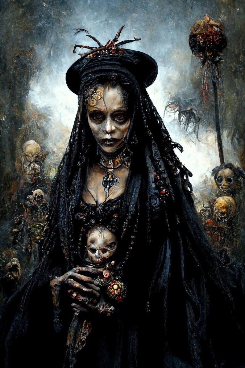 Знакомство с ней у меня случилось пару лет назад, но активного взаимодействия тогда не было в работах. В то же время произошло знакомство с ее супругом Бароном Самеди. В первом знакомстве, я увидела ее в осознанном сне. Я оказалась посреди кладбища только видно было что оно не нашенское. Там стоял круглый стол с разными красочными вещицами типа свечей, каких-то веников и прочего. А позади стола стояла она. Тогда она приняла облик молодой светловолосой женщины. Потом были работы личного характера с проблемой увязанной на тему Вуду, в которых мне помог ее супруг Барон Самеди - выглядевший ну чисто как на картинках, в фиолетовом цветастом пиджаке, на котором были вышиты черепа, в шляпе, с сигарой. Так вот, а мама Бриджит помогла мне совсем недавно. Немного расскажу чем. Вообще, духи Лоа тесно связаны с темой Магии теней. С нею же связан и уже наш Хранитель кладбища, и Хранитель мира Кошмаров тоже. Вуду тематика мало нам знакомая, но как оказалось их представители могут выйти с тобой на с