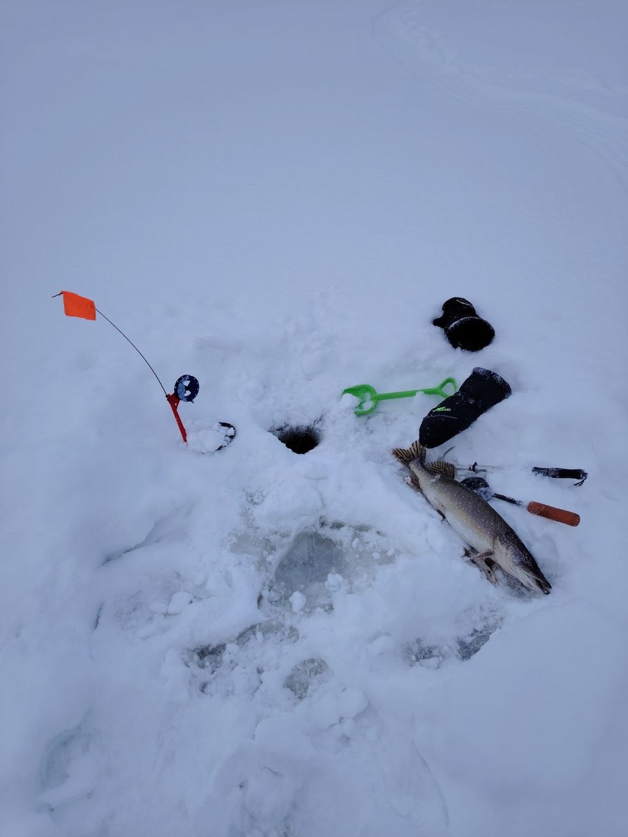 Всем доброго времени суток! Выдался свободный день 11.01 и я не задумываясь решил ехать на рыбалку! Накануне Москву завалило снегом, потому дорога с санками до места была не из простых. Снега по колено, да еще вода под снегом, но в 7 я уже расставлял жерлицы. Ставлю их по точкам поимки предыдущих щук, ну и часть я решил расставить на русло и русловые бровки. Еще не рассвело, а уже первый загар, к сожалению холостой, но плотву порвало знатно. Жду рассвет, а загаров все нет. Часов в 10 срабатывает флаг на дальней жерлице. Но ложная тревога, мелкий карасик слегка помят, возможно судачок баловался, жерлица стояла недалеко от русла. Подловил плотвичек на живца, поменял часть карасиков на плотвиц. В 13 я пошел проверить живца на части жерлиц, которые стояли поближе к берегу на рабочих точках. И сразу там пошли загары. на мелкого карасика взяла щучка грамм на 800, потом сразу флаг на соседней жерлице. Сразу ощущение тяжести и борьба минут пять, чтобы подвести к лунке и багром достать на пове