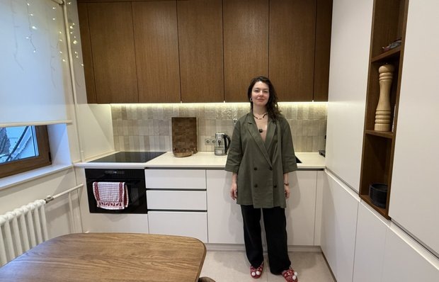 Решили вопрос хранения и создали спокойный, уютный интерьер Как обустроить функциональное и стильное пространство в типовом панельном доме? Узнайте в нашем новом румтуре! Герой румтура: архитектор Сабина Неровня обустроила двушку для семейной пары с пятилетним ребенком. Кратко о квартире: квартира находится в панельном доме серии П-46М. В планировку изменений не вносили, но полностью обновили все остальное: отделку, окна, электропроводку и сантехнику. В квартире есть отдельная кухня, детская, спальня-гостиная, прихожая и совмещенный санузел. Посмотрите, каким уютным и обволакивающим получился интерьер — в нем доминируют нежные оттенки, искусно подчеркнутые теплыми древесными фактурами. От двери в кухню отказались, но обрамили проход шпоном — этот тактильно привлекательный материал защищает углы и создает ощущение тепла и комфорта. Большая комната преобразилась и стала многофункциональной: здесь органично расположились и элегантная гостиная, и приватная спальня. Такое зонирование позво
