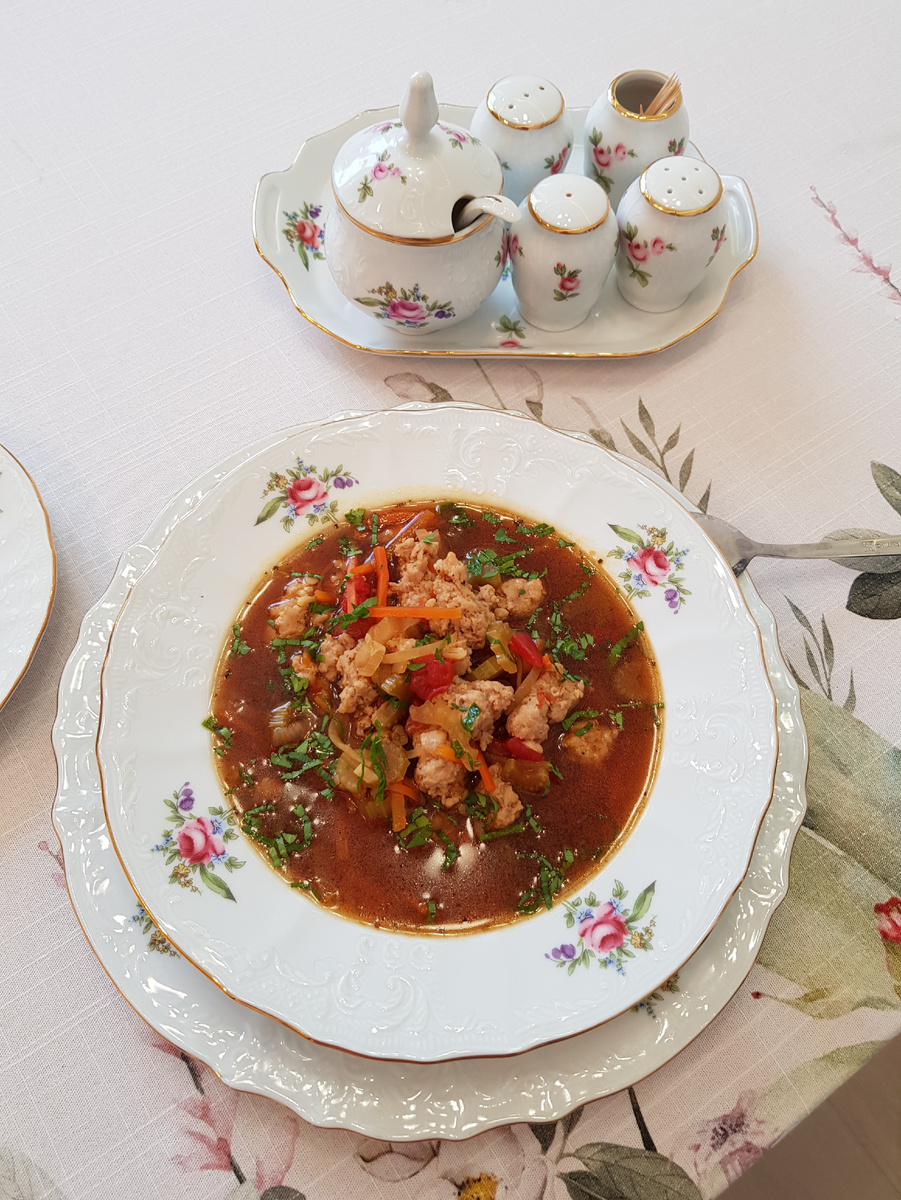 Добрый день, дорогие друзья! В Сибири температура опустилась ниже -30 градусов по Цельсию, и горячий, сытный суп становится основным блюдом в домах многих сибиряков. Сегодня я представляю вашему вниманию ароматный суп на говяжьем бульоне с классическим набором овощей, дополненный для сытности булгуром и кнелями. Используемый в этом рецепте метод приготовления кнелей позволит ускорить приготовление по сравнению с классическим методом, описанным в кулинарных книгах. Для приготовления 10 порций нам понадобятся: 1 литр концентрированного говяжьего бульона, 250 грамм томатов кусочками, 250 грамм репчатого лука, 250 грамм моркови, 250 грамм сельдерея, 120 грамм булгура, 2 столовые ложки подсолнечного масла, 1 чайная ложка соли, 1 чайная ложка сахара, 1 столовая ложка приправы греческой, 650 грамм свиного фарша, состоящего из 550 грамм свинины, 50 граммов репчатого лука, 50 грамм говяжьего бульона, 1/2 чайной ложки соли, 1/4 чайной ложки черного молотого перца. Приготовление: нарезать лук че