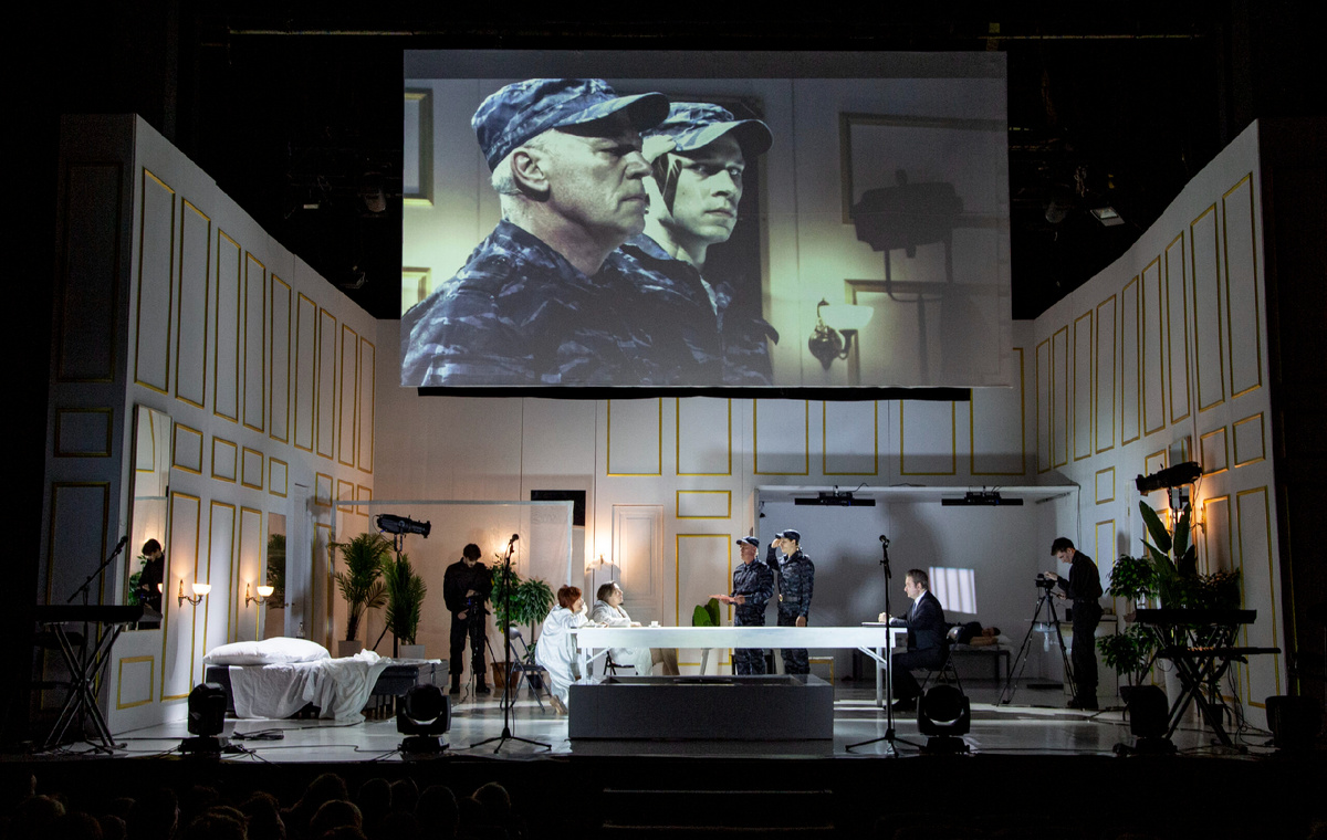 Сценография спектаклей похожая. Всё происходящее на сцене транслируетсч на огромный экран, так что даже на дальних рядах хорошо видно лица актёров, мимика, жесты.