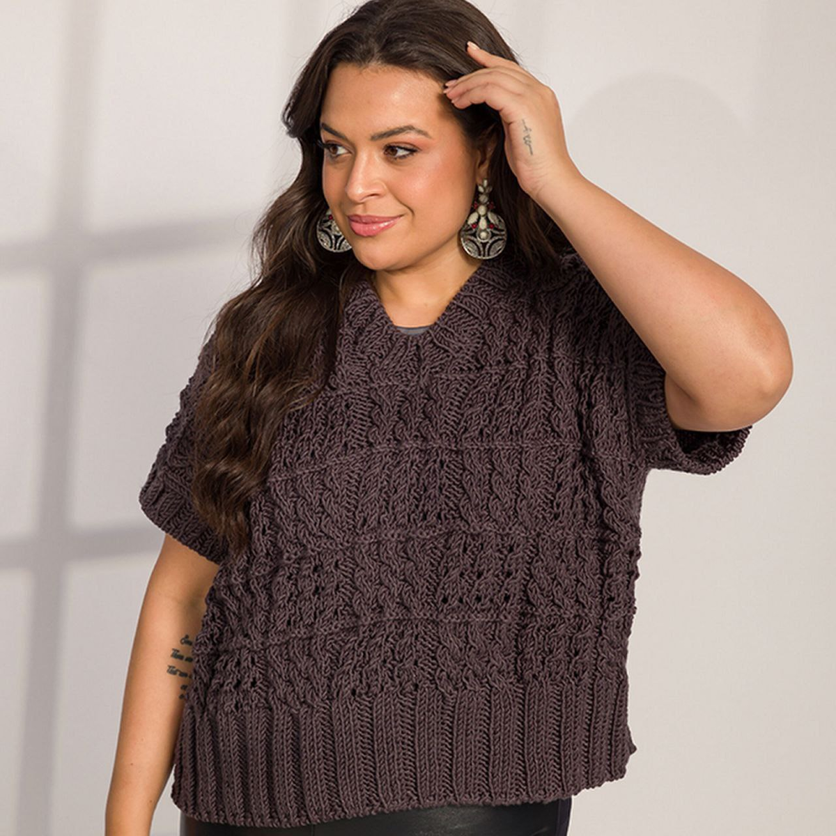 Кто сказал, что объёмные узоры должны обязательно полнить? Всё зависит от того, как рисунок распределён на изделии. Посмотрите на это необычное решение — дорожки из объёмных жгутов и ажуры, разделённые изнаночными полосами. Именно такое чередование создаёт визуальный эффект вытягивания фигуры.