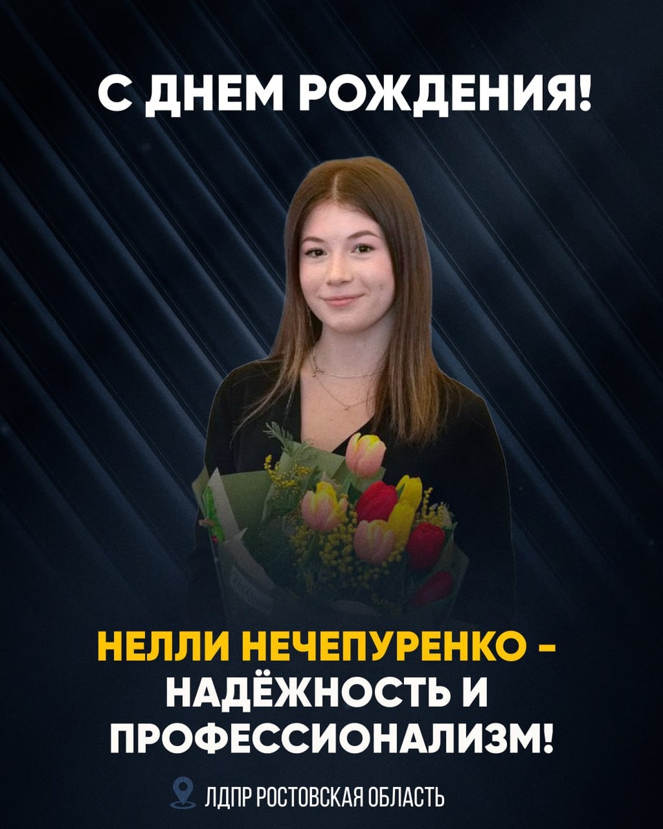 ! 💠 Сегодня свой день рождения отмечает наша коллега и надёжный единомышленник — Нечепуренко Нелли. Вы — человек, на которого всегда можно положиться: внимательный, отзывчивый и ответственный. Ваша поддержка, аккуратность в работе и искреннее отношение к делу ценятся коллегами. ✨✨✨ Ростовское региональное отделение ЛДПР поздравляет с днём рождения и желает крепкого здоровья, благополучия, успехов во всех начинаниях и хорошего настроения. Пусть каждый день приносит радость, а рядом всегда будут надёжные и добрые люди. Дорогие подписчики, благодарим Вас за поддержку! Ваши реакции, приглашения друзей и репосты позволяют нам развиваться. Не забывайте ставить 👍👍👍