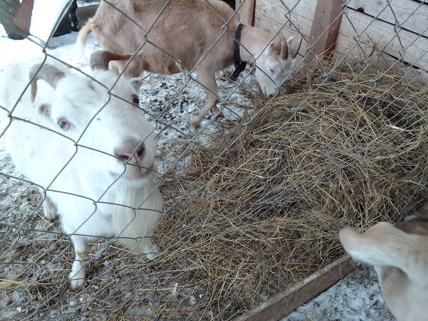 У меня тут в комментариях спрашивают, как мои козочки поживают таким снежным и морозным январем?) Не мерзнут ли, гуляют ли по снегу, что едят и все прочее в том же роде. Ну что сказать. Зима для коз, как и для других животных - время, наверняка, не самое любимое. Холодно, зачастую ветрено, да еще и сугробы выпали по колено. По таким уж точно не побегаешь, да и смысл? Вкусной сочной травы под ними нет, еще и снег к копытам прилипает. Уж лучше в загончике по толстому слою сена походить, того же сена пожевать, да еще теплой водички из тазика попить, когда хозяйка принесет. Вот и все развлечение. Ленивая у коз зима и все тут. Так и "тусят" козы в загоне целыми днями, какой бы на улице ни был минус. Только когда темнеет самостоятельно заходят в свои сараи, мне остается только дверь закрыть и одеяло для пущего утепления, прибитое к каждой двери опустить. А в течении дня козы едят и развлекаются...наблюдением за нами) Только и смотрят, как мы с мужем бегаем туда-сюда по двору - то снег лопат