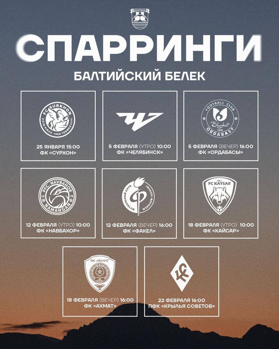💙 До старта весенней части РПЛ наша команда проведет серию контрольных встреч. Сохраняйте расписание, чтобы быть в курсе всех матчей! 🗓 КАЛЕНДАРЬ ИГР: 25 января, 15:00 — ФК «Сурхон» 🇺🇿 5 февраля, 10:00 — ФК «Челябинск» 🇷🇺 5 февраля, 16:00 — ФК «Ордабасы» 🇰🇿 12 февраля, 10:00 — ФК «Навбахор» 🇺🇿 12 февраля, 16:00 — ФК «Факел» 🇷🇺 18 февраля, 10:00 — ФК «Кайсар» 🇰🇿 18 февраля, 16:00 — ФК «Ахмат» 🇷🇺 22 февраля, 16:00 — ПФК «Крылья Советов» 🇷🇺 Дата, соперник и время начало встреч по Калининграду — на инфографике выше! О трансляциях матчей мы сообщим дополнительно. Сохраняйте себе, чтобы не потерять 😉