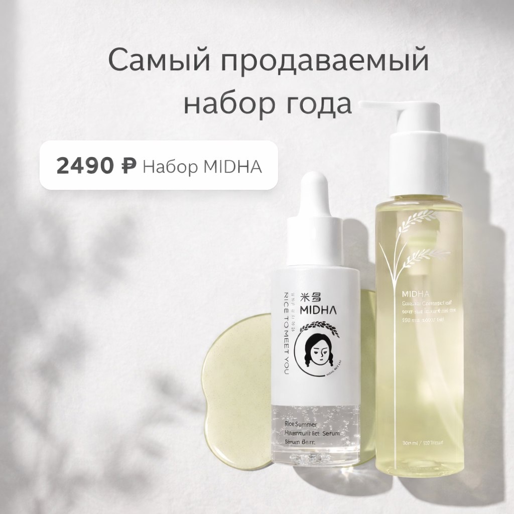 ) По результатам продаж самым популярным набором года стал уход от бренда MIDHA — без громких обещаний, но с реальным результатом. 💚 Ваш фаворит — дуэт: 💧 Увлажняющая сыворотка с гиалуроновой кислотой MIDHA 🌾 Гидрофильное масло для мягкого очищения с экстрактом риса MIDHA 🎉И мы решили сделать для подписчиков канала особенное предложение. 🌿 Почему именно этот набор? 💧 MIDHA Hyaluronic Hydrating Serum Лёгкая, прозрачная, как вода, но работающая глубоко. ✔ интенсивно увлажняет ✔ снимает ощущение стянутости ✔ делает кожу более гладкой и «наполненной» ✔ подходит для любого типа кожи, даже чувствительной Сыворотка быстро впитывается, не липнет и отлично работает как самостоятельный уход или под крем. 🌾 MIDHA Rice Cleansing Oil Мягкое гидрофильное масло с экстрактом риса — очищение без агрессии и пересушивания. ✔ растворяет макияж и SPF ✔ очищает поры ✔ не нарушает кожный барьер ✔ не оставляет плёнки После него кожа чистая, спокойная и готовая к уходу, а не «наказанная» у