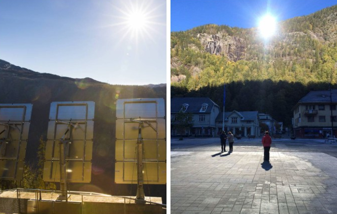 В Рьюкане применяется уникальная технология использования зеркал для освещения города в период зимнего мрака, который длится с сентября по март из-за окружающих гор.