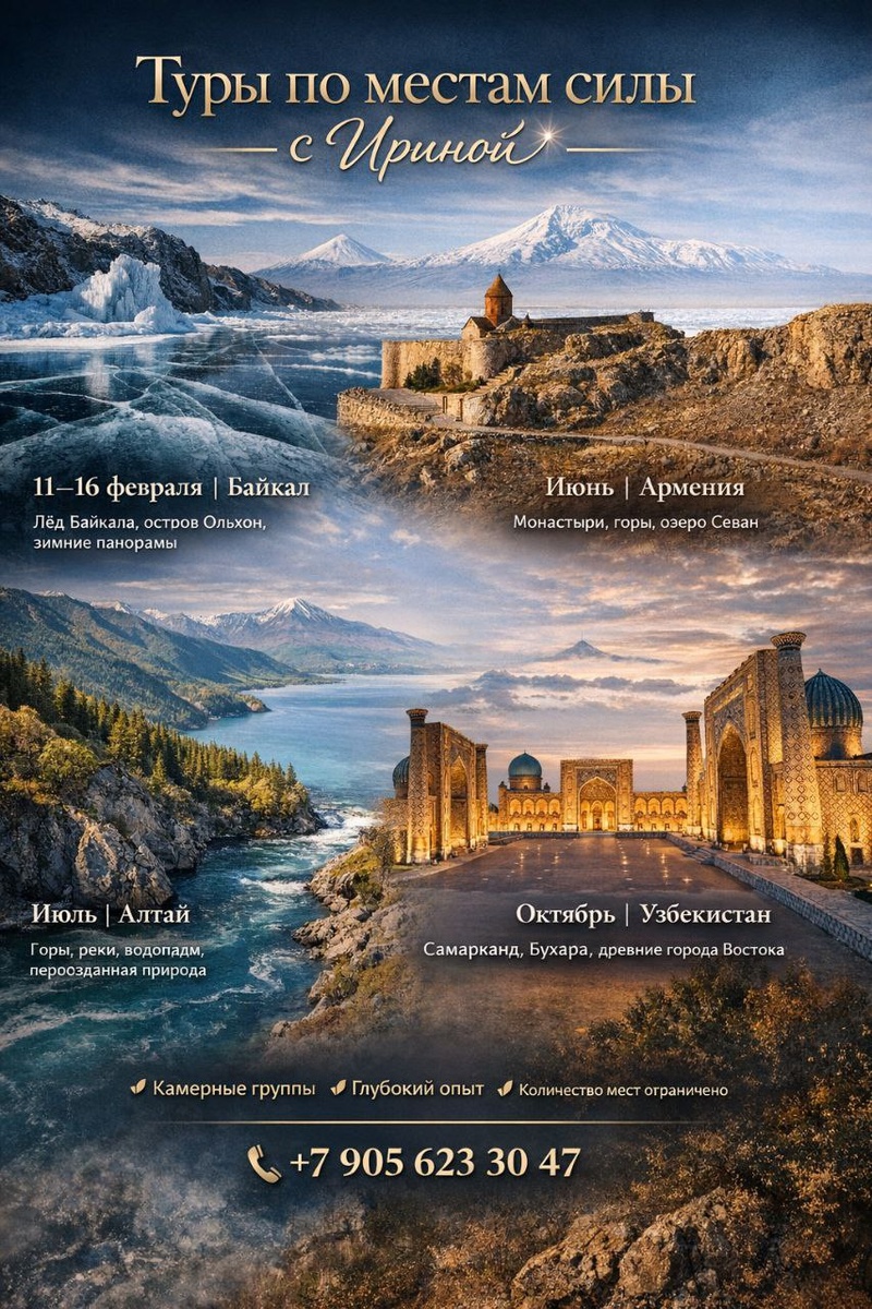 ⚠️ 🔥🌍Путешествия для тех, кто хочет не просто увидеть новые страны, а еще и прожить незабываемый опыт. ⠀ 💫Туры с Ириной — это сочетание красивых и значимых локаций, интересных активностей, меняющих сознание практик и внутренней работы. ⠀ ✨11–16 февраля — Байкал ⠀ Зимний Байкал — это прозрачный лёд с узорами, торосы, бескрайние ледяные поля. Прогулки по льду, поездки к знаковым бухтам и островам, панорамы, которые невозможно забыть. Место, где масштаб природы возвращает ощущение опоры и ясности. 👉Группа набрана, но есть ещё 2 места. ⠀ ✨8–14 Июня — Армения ⠀ Горные дороги, древние монастыри и храмы, стоящие на краю ущелий, озеро Севан, старинные города и каменные плато. Армения раскрывается через свою историю, архитектуру и ощущение глубины времени. ⠀ ✨Июль — Алтай ⠀ Горные перевалы, бирюзовые реки, долины, водопады и высокогорные озёра. Пространства, где природа почти не тронута человеком. Алтай впечатляет своей мощью, простором и живой красотой. ✨Октябрь — Узбекистан Самарканд,
