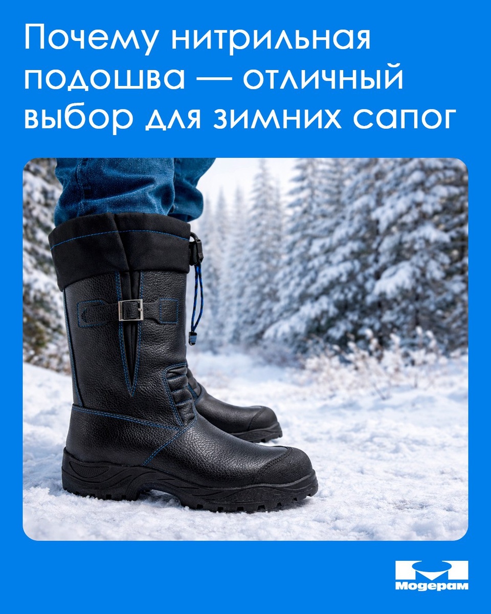 комфорт в мороз. Нитрильная резина (NBR) — один из самых надежных материалов для подошв зимней обуви, и вот почему её выбирают: ✅ Устойчивость к низким температурам Нитрил не дубеет, не трескается и сохраняет гибкость на морозе — обувь остаётся комфортной даже в сильный холод. ✅ Хорошее сцепление со льдом и снегом Материал обладает высоким коэффициентом трения. В сочетании с глубоким протектором это снижает риск скольжения. ✅ Износостойкость и долговечность Нитрил устойчив к абразивам, дорожным реагентам и соли — поэтому подошва служит дольше и не разрушается. ✅ Масло- и бензостойкость Подошва не повреждается техническими жидкостями — важное преимущество для городской и рабочей обуви. ✅ Не впитывает влагу Материал не набирает воду, не деформируется и сохраняет форму — зимой это критично. Именно поэтому нитрильная подошва — оптимальный баланс между безопасностью, комфортом и сроком службы, благодаря чему её выбирают для зимних сапог в городских, туристических и профессиональных м