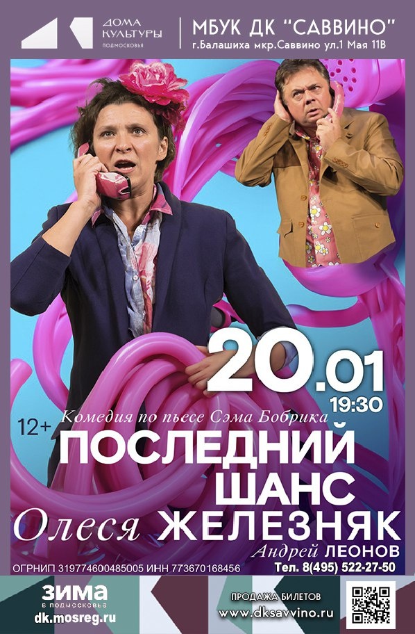 ! ✨20 января | 19:30 ПОСЛЕДНИЙ ШАНС - комедия по пьесе Сэма Бобрика Продолжительность: 2 часа 10 минут (с антрактом) Билеты: iframeab-pre5701.intickets.ru/seance/690... ✨31 января | 19:00 Классический балет "Золушка" Балет в 2-х актах Либретто по сказке Шарля Перро Билеты: ballet-russia.intickets.ru/seance/677...