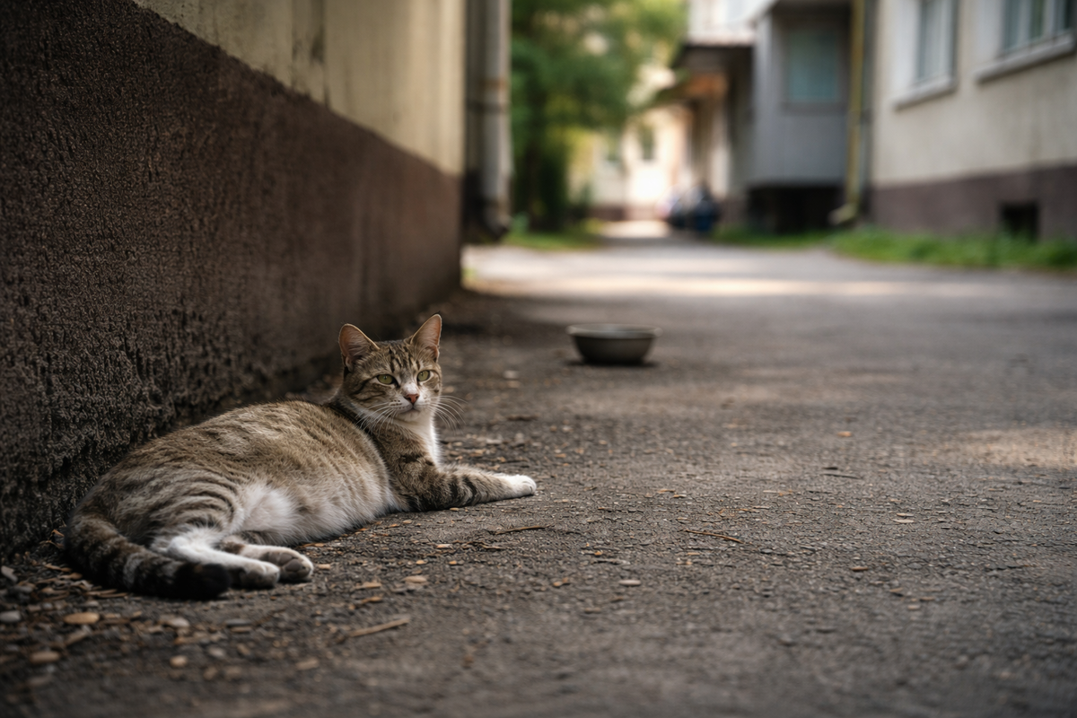Она появляется между двумя подъездами, где обычно никто надолго не задерживается. Там всегда тень, даже днём. Асфальт тёплый, но неровный. Она ложится так, чтобы не мешать.