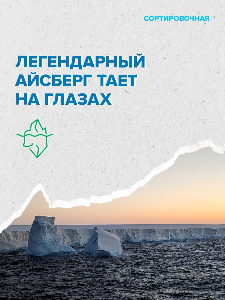 А23а — настоящий долгожитель. Он откололся от шельфового ледника ещё в 1986 году и почти 40 лет находится под наблюдением учёных. Проведя три десятилетия на мели, айсберг отправился в эпическое путешествие и достиг относительно тёплых вод у острова Южная Георгия. Здесь и началось его стремительное разрушение. Цифры, иллюстрирующие этот процесс: • от своей первоначальной массы айсберг уже потерял 78%; • в конце августа он лишился крупных фрагментов и звания самого большого айсберга планеты; • сейчас он интенсивно теряет лёд. Подпишись — будь на зелёной стороне | Сортировочная в MAX