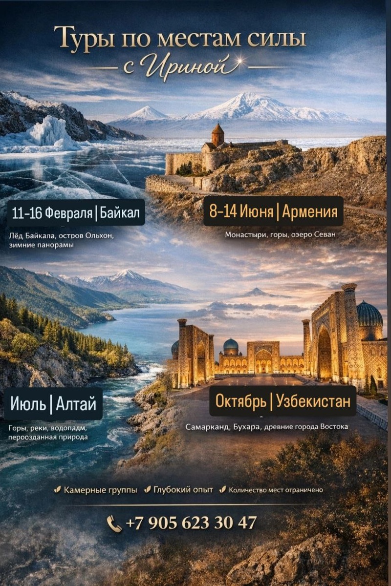 ⚠️ 🔥🌍Путешествия для тех, кто хочет не просто увидеть новые страны, а еще и прожить незабываемый опыт. ⠀ 💫Туры с Ириной — это сочетание красивых и значимых локаций, интересных активностей, меняющих сознание практик и внутренней работы. ⠀ ✨11–16 февраля — Байкал ⠀ Зимний Байкал — это прозрачный лёд с узорами, торосы, бескрайние ледяные поля. Прогулки по льду, поездки к знаковым бухтам и островам, панорамы, которые невозможно забыть. Место, где масштаб природы возвращает ощущение опоры и ясности. 👉Группа набрана, но есть ещё 2 места. ⠀ ✨8–14 Июня — Армения ⠀ Горные дороги, древние монастыри и храмы, стоящие на краю ущелий, озеро Севан, старинные города и каменные плато. Армения раскрывается через свою историю, архитектуру и ощущение глубины времени. ⠀ ✨Июль — Алтай ⠀ Горные перевалы, бирюзовые реки, долины, водопады и высокогорные озёра. Пространства, где природа почти не тронута человеком. Алтай впечатляет своей мощью, простором и живой красотой. ✨ Октябрь — Узбекистан Самарканд