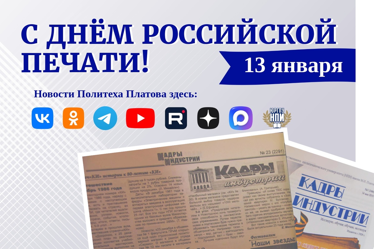«…Нельзя не видеть, что в наши дни пресса является могущественной силой. Число русских читателей увеличивается со дня на день, пресса становится более деятельной, необходимость дать работу мысли проявляется во всех классах общества. <…> Нужна сила активная, творческая сила, сила прессы, творящая благо». П.А. Вяземский Сегодня, 13 января, в нашей стране сотрудники всевозможных средств массовой информации отмечают свой профессиональный праздник – День российской печати. Медиакоманда ЮРГПУ (НПИ) – тоже в числе виновников торжества. Радость этого дня мы, по традиции, хотим разделить с нашими многочисленными друзьями – профессорами и преподавателями, студентами и аспирантами, работниками структурных подразделений университета и его руководством. Именно вы, уважаемые новочеркасские политехники, а также процесс и плоды вашего труда – это то, что является смыслом и вдохновением для нашей работы. А работа у нас интересная: мы каждый день на связи с вами, и не устаём рассказывать о политехничес