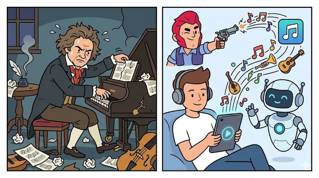 Доступность. Не нужно музыкальное образование, знание нотной грамоты или умение играть на инструментах. Описываете что хотите текстом — получаете готовый трек. Это открывает музыку для людей, которые раньше даже не задумывались о создании собственных композиций.