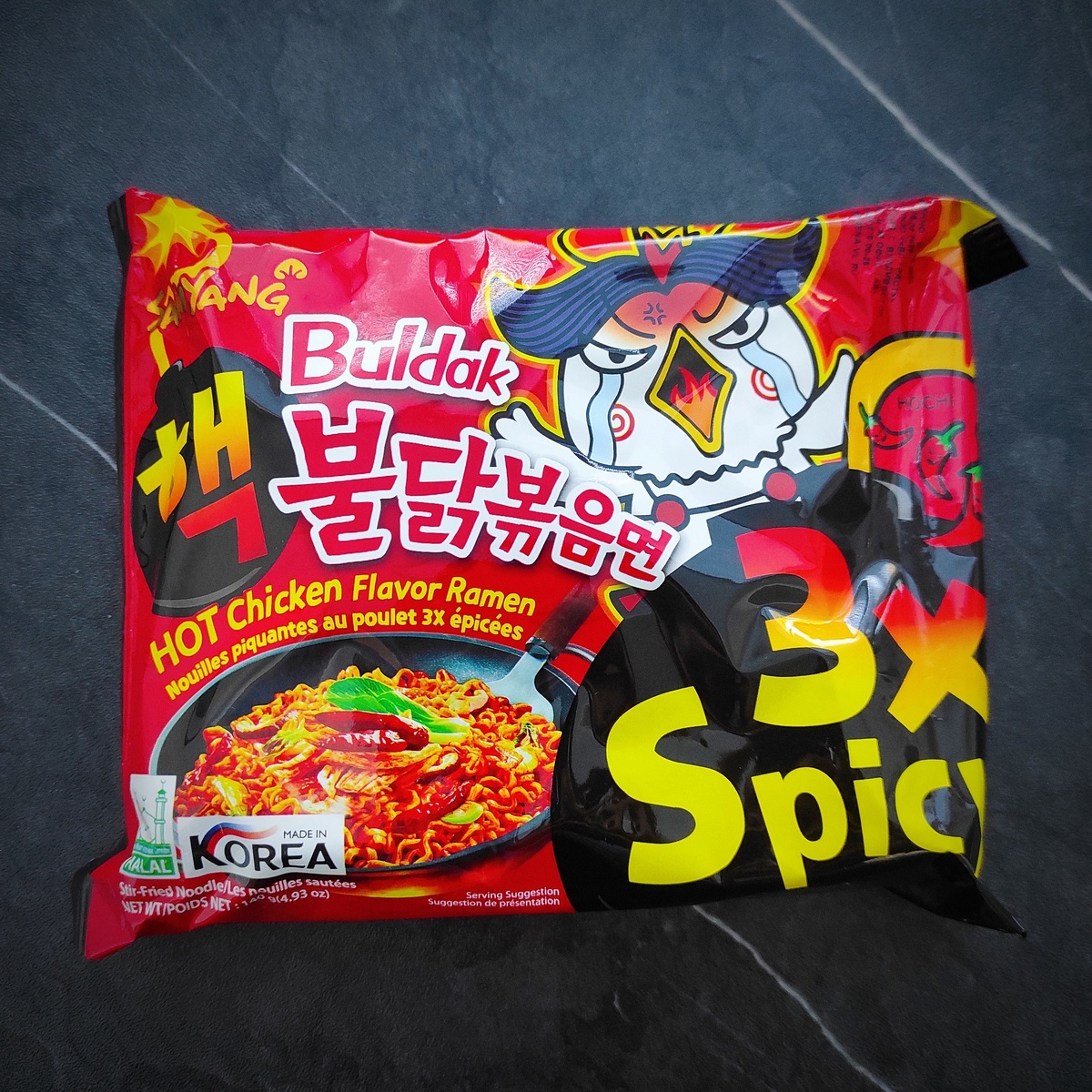 Здрав будь, путник. Как-то полгода назад решил испытать на себе все прелести данной лапши, начитавшись отзывов в интернете. Сам я - любитель Самьянга, в особенности - сырной и карбонары. Не сомневаюсь, что многие пикабутяне уже оставляли своё мнение насчёт этого "произведения лапшичного искусства". Вот и мне посчастливилось с этим столкнуться... Цена в маркет плейсе - 270 руб. за 140 грамм. Внутри нас ждёт лапша с плотной структурой, пакет с острым соусом и пакет с присыпкой для украшения блюда. Далее готовим лапшу по инструкции. Кладём в кипящую воду, варим 5 минут, сливаем воду. Перекидываем лапшу на сковороду, добавляем соус и обжариваем с небольшим количеством этой воды до выкипания, периодически перемешивая. Получается карамелизация соуса или типа того. В процессе готовки от соуса шёл пар с очень специфическим запахом, от которого в голове возникали мысли, что есть это категорически не стоит. Но при этом текли слюни. Выкладываем готовую лапшу и украшаем её кунжутом и водорослями.