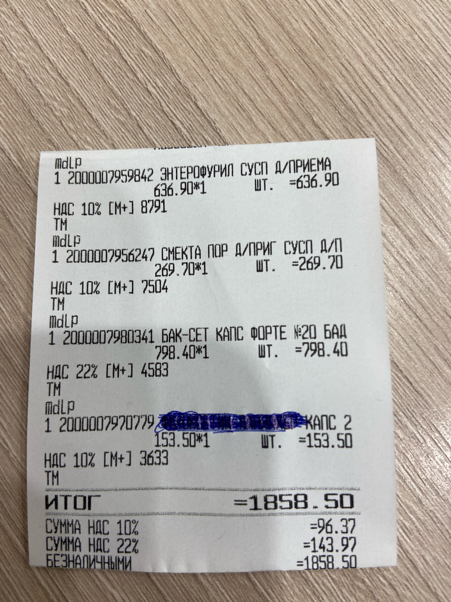 Звонок врачу, ожидание, осмотр. Педиатр подтвердил догадки, выписал рекомендации и список того, что нужно срочно купить. Муж остался с больным малышом, а я отправилась в аптеку. Чек на 1858 рублей. Правда, тут есть нюанс — один из препаратов в чеке я пью сама каждый день, его стоимость около 150 рублей. Но остальное — это именно "экстренная" статья: энтеросорбенты, пробиотики. Болезнь всегда приходит не вовремя и без скидки.